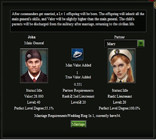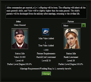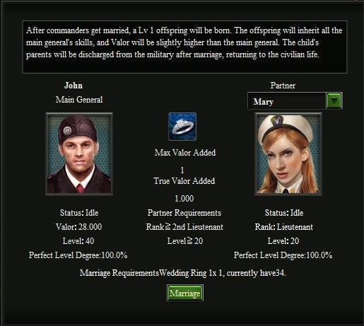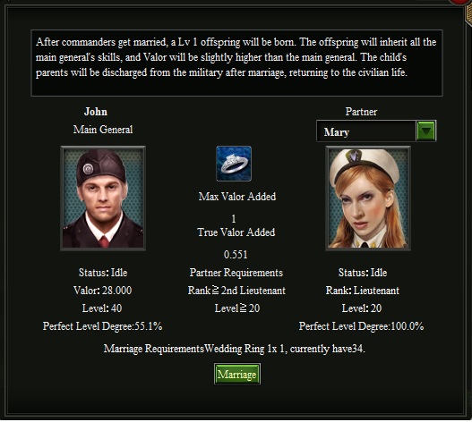 These are the basics of marriage, as your commanders get higher ranked they will need more Levels and high ranks to marry each other but the requirements are explained in the marriage screen.